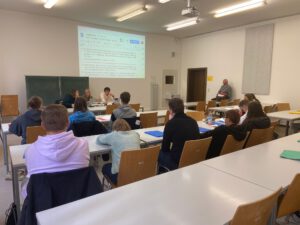 Um neun Uhr ging es dann direkt los mit einem Grußwort von Malte Gallée, seines Zeichens Abgeordneter im Europäischen Parlament der Grünen. Malte Gallée erklärte den Schüler:innen seine Aufgaben im EU-Parlament, sowie dessen Bedeutung für die Gesetzgebung in der EU.