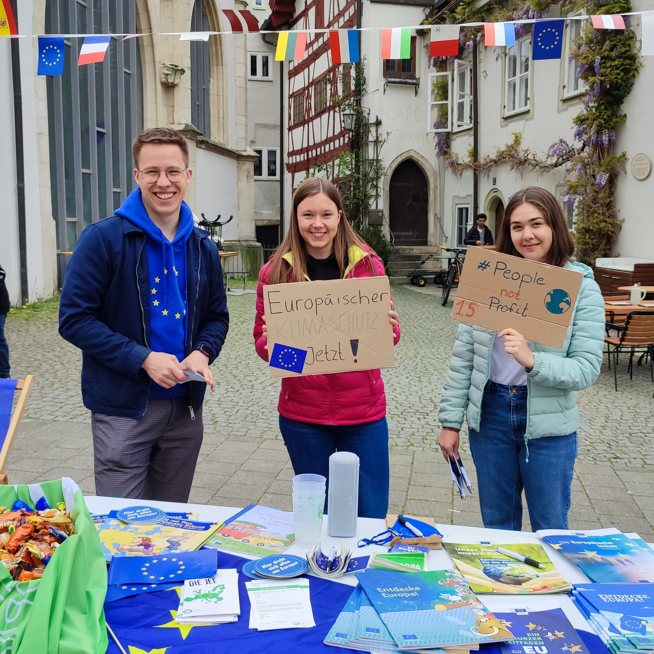Des Weiteren organisieren wir Veranstaltungen und Aktionen, wie Pub Quizze oder öffentliche Diskussionen. Ein großes Projekt ist auch Europe@School, das wir letztes Jahr zum ersten Mal mit einer Realschule im Landkreis Eichstätt durchgeführt haben und seitdem immer weiter ausbauen. Beim Refugium und der Erstimesse an der KU Eichstätt sind wir ebenfalls immer vertreten.